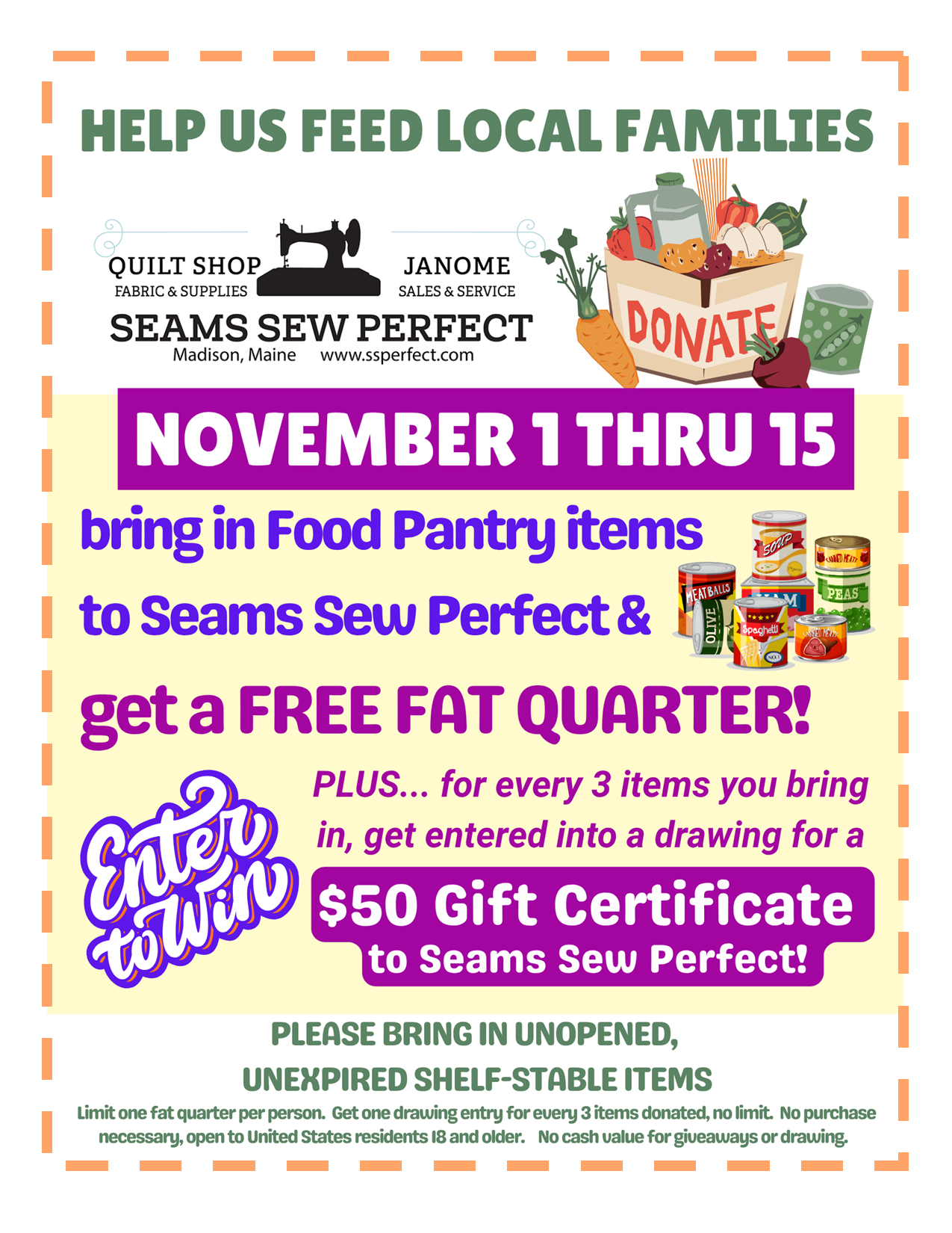 We’re having a Food Pantry Drive to help our community. Saturday November 1 thru Saturday November 15, bring in food pantry items to Seams Sew Perfect and we’ll give you a FREE FAT QUARTER! And for every 3 items you bring in, get an entry into our drawing for a $50 Gift Certificate to Seams Sew Perfect! The more items you donate, the more chances to win.